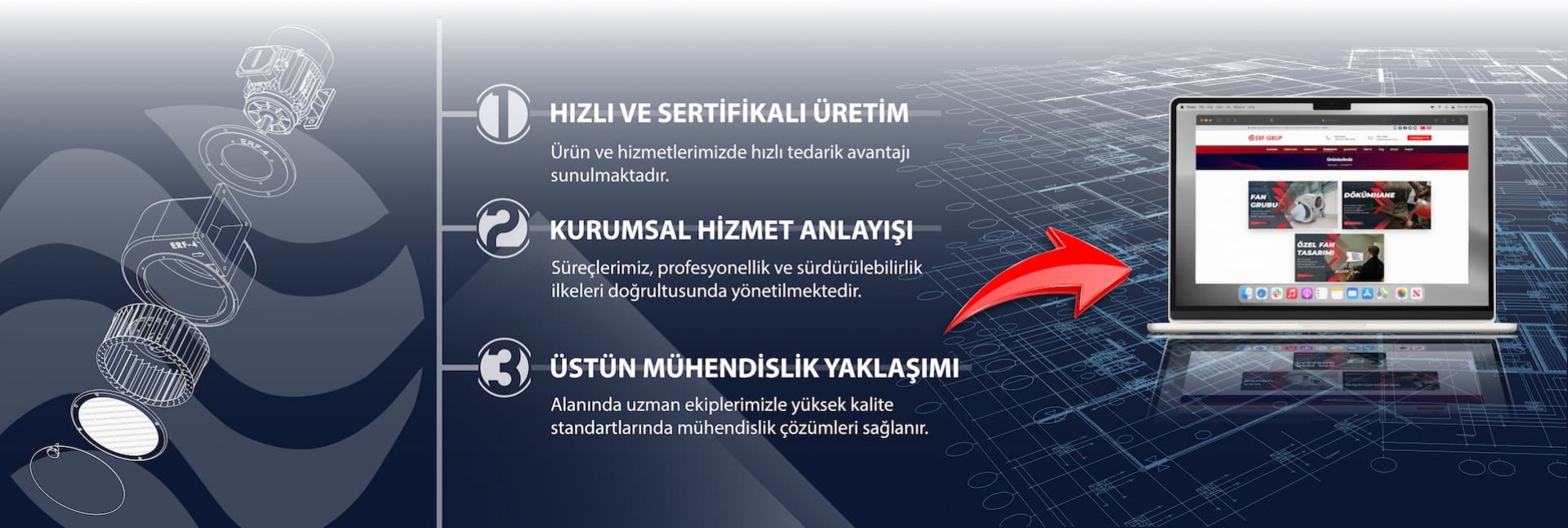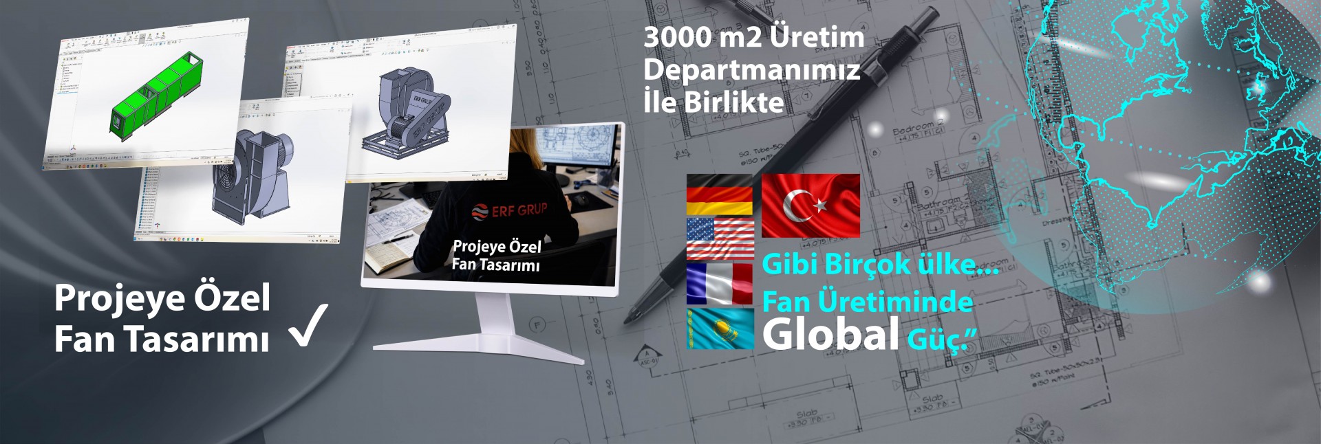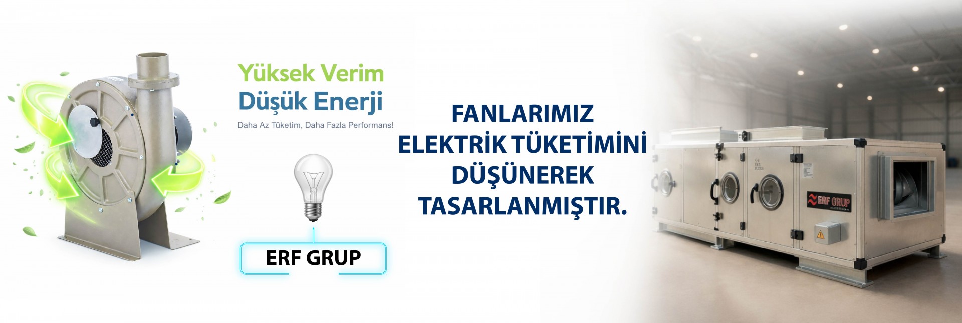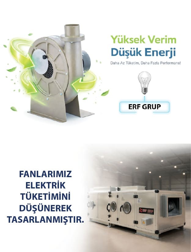 ERFGROUP olarak kaliteli ürün ve müşteri memnuniyetine önem göstermekte olup hedefleri doğrulutusunda yapmış olduğu yatırımlar ile 3000 m2 üretim departmanımız fan ve salyagoz gruplarının imalatı üzerine son teknoloji makinaları ile hizmet vermektedir.