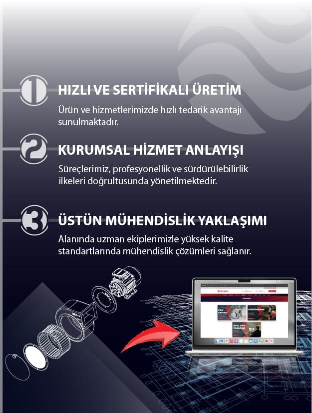 Firmamız tümüyle yerli sermaye ile kurulmuş olup fan ve salyangoz gruplarında kaliteyi ön plana çıkartıp siz değerli müşterilerimizin güvenine layık olmaya çalışmaktadır. Türkiye önde olmak üzere dünya geneline üretim yapma kapasitesine ve kalitesine sahip bilgi birikimi ve tecrübeli personelle fan ve salyangoz ürünlerinin imalat ve satışında öncü kuruluşlar arasına girmeyi hedeflemektedir.